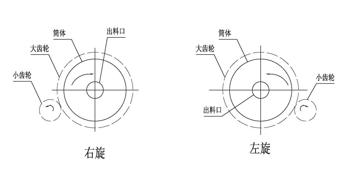 有許多客戶(hù)經(jīng)常會(huì)問(wèn),怎么才能正確的判斷球磨機(jī)運(yùn)轉(zhuǎn)時(shí)是左旋還是右旋,今天河南豫暉礦山機(jī)械有限公司技術(shù)人員以圖為為例為大家解這個(gè)因惑:要想判斷球磨機(jī)是左旋還是右旋,要從球磨機(jī)出料口(靠近大齒輪一端)向進(jìn)料口方向看,筒體逆時(shí)針旋轉(zhuǎn)為左旋,筒體順時(shí)針旋轉(zhuǎn)為右旋;在布置圖上,左旋布置時(shí),傳動(dòng)部分(過(guò)橋)在筒體右側(cè);右旋布置時(shí),傳動(dòng)部分(過(guò)橋)在筒體左側(cè)。如下圖所示: