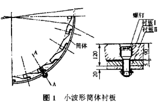在簡體橫斷面上,沿筒體圓周有24塊小波形襯板一塊壓著一塊,格子型球磨機(jī)每塊用2只M36螺釘與筒體固定,相鄰倆塊在筒體長度方向上的間隙錯(cuò)開,格子型球磨機(jī)通過長期對其使用和失效情況的考察發(fā)現(xiàn),失效報(bào)廢幾乎都是因螺釘松動(dòng)引起格子型球磨機(jī)筒體漏砂。
